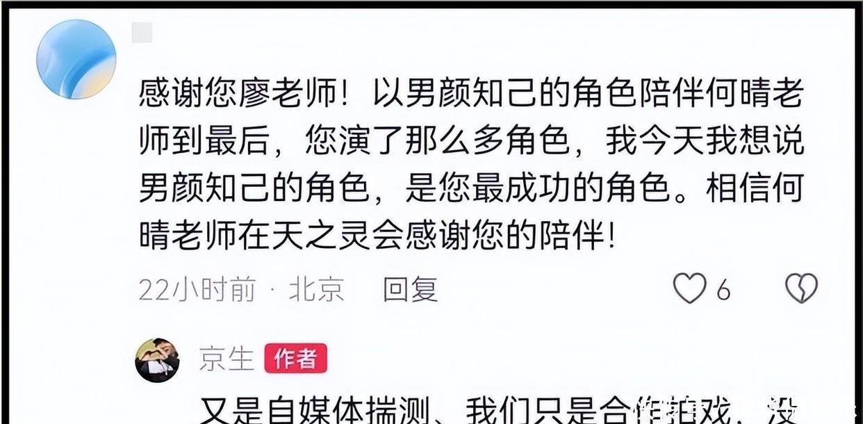 后来大家又猜是廖京生,毕竟他和何晴传了多年绯闻。2008年两人合作《谁是我爸爸》演过夫妻,之后就有传言说他们再婚了,还说廖京生多年来一直细心照顾何晴。廖京生很快出来澄清,说那些消息都是媒体瞎编的,拿已故之人炒作太没道德了。